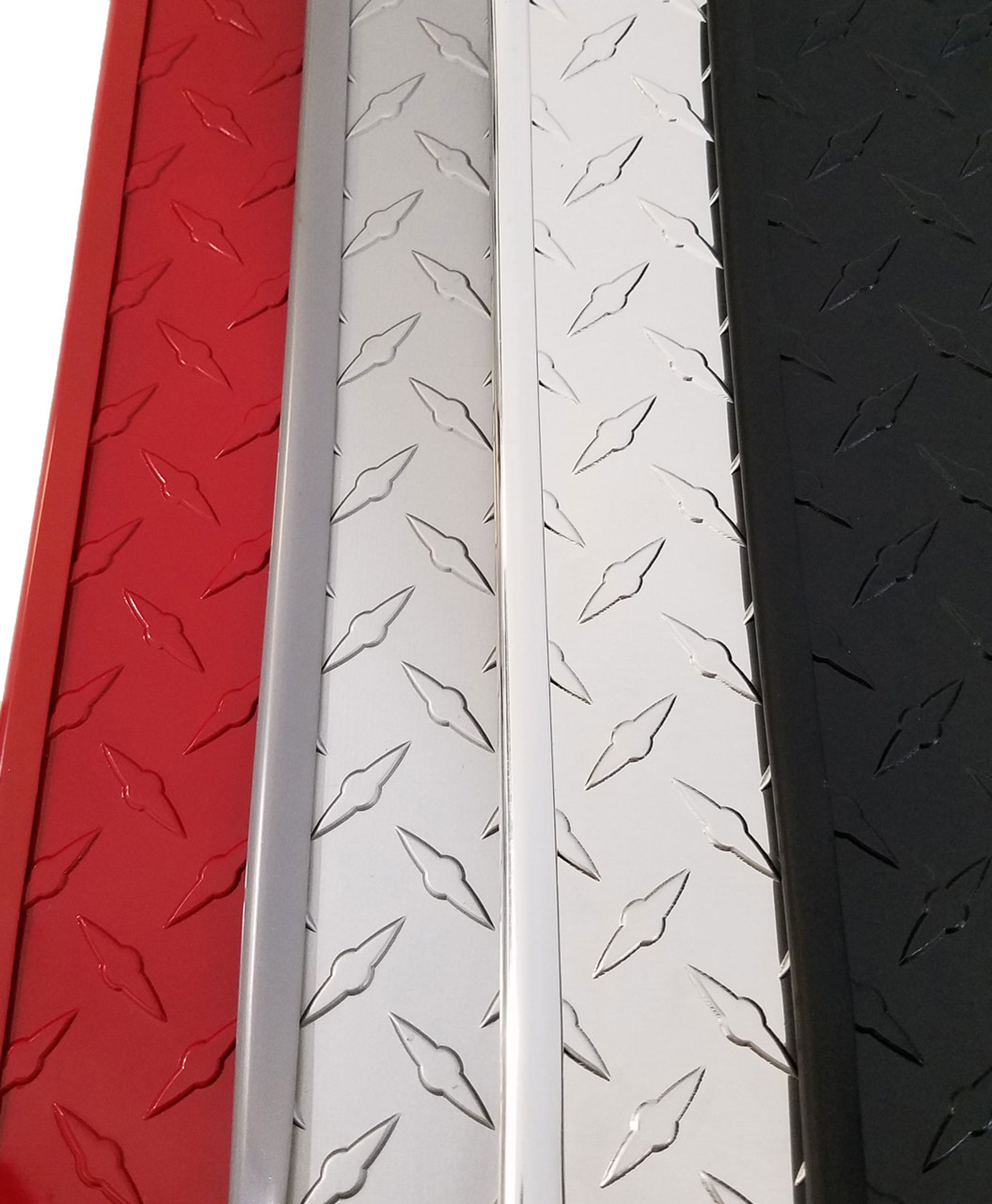50 feet of vinyl edge trim molding for our diamond plate wainscoting. Vinyl edge trim molding installation is a breeze, just push it onto the unfinished edge and voila! The adhesive bead inside the molding will keep it in place. This vinyl trim molding fits on our .024, .045 and .063 diamond plate sizes (cosmetic, light duty and standard duty). It is not appropriate for thicker materials. This vinyl edge trim molding is manufactured in the USA and appropriate for both indoor and outdoor applications.